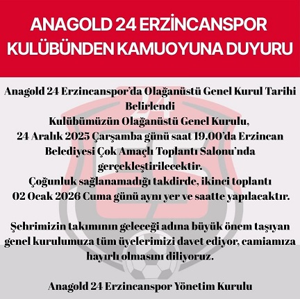 24Erzincanspor Yönetim Kurulundan yapılan açıklamada; 24Erzincansporda olağanüstü genel kurul tarihi belirlendi. Kulübümüz Olağanüstü Genel Kurulu 24 Aralık 2025 Çarşamba günü sat 19.00 da Erzincan Belediyesi Çok Amaçlı Toplantı salonunda gerçekleştirecektir. Çoğunluk sağlanamadığı takdirde 2. Toplantı 02 Ocak 2026 Cuma günü aynı saat ve yerde yapılacaktır.