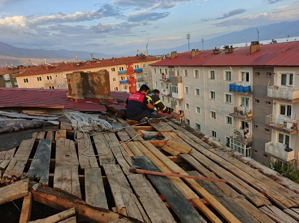 Erzincan’da akşam saatlerinde sağanak yağmur ile birlikte başlayan fırtına sonrası 112 Acil Çağrı Merkezi’ne gelen ihbarda Erzincan Merkez Akşemsettin Mahallesinde çatı uçması yaşandığı belirtildi. Yapılan ihbar sonrası ivedilikle olay yerine intikal eden ekipler çatıda tehlike arz eden maddeleri indirerek olay yeri güvenliğini sağladılar.