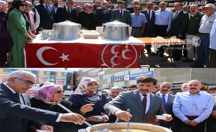 Erzincan Cumhuriyet meydanında gerçekleştirilen Aşure dağıtım etkinliğine Erzincan Belediye Başkan Bekir Aksun, MHP İl Başkanı Salih Aksu, MHP Kadın Kolları Başkanı Serpil Ayaz, MHP ilçe belediye başkanları, BBP İl Başkanı Tolga Altınoluk, ve partililerinde katıldığı etkinlige vatandaşlar da yoğun ilgi gösterdi.